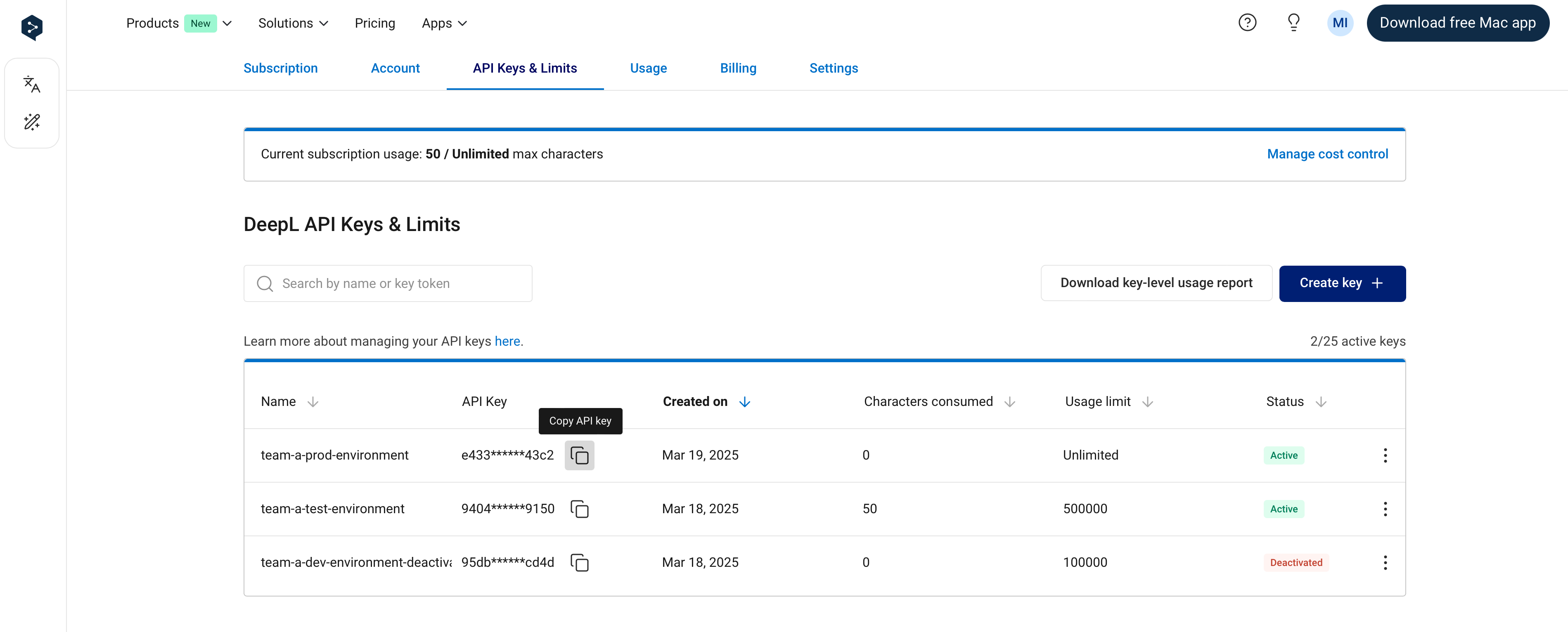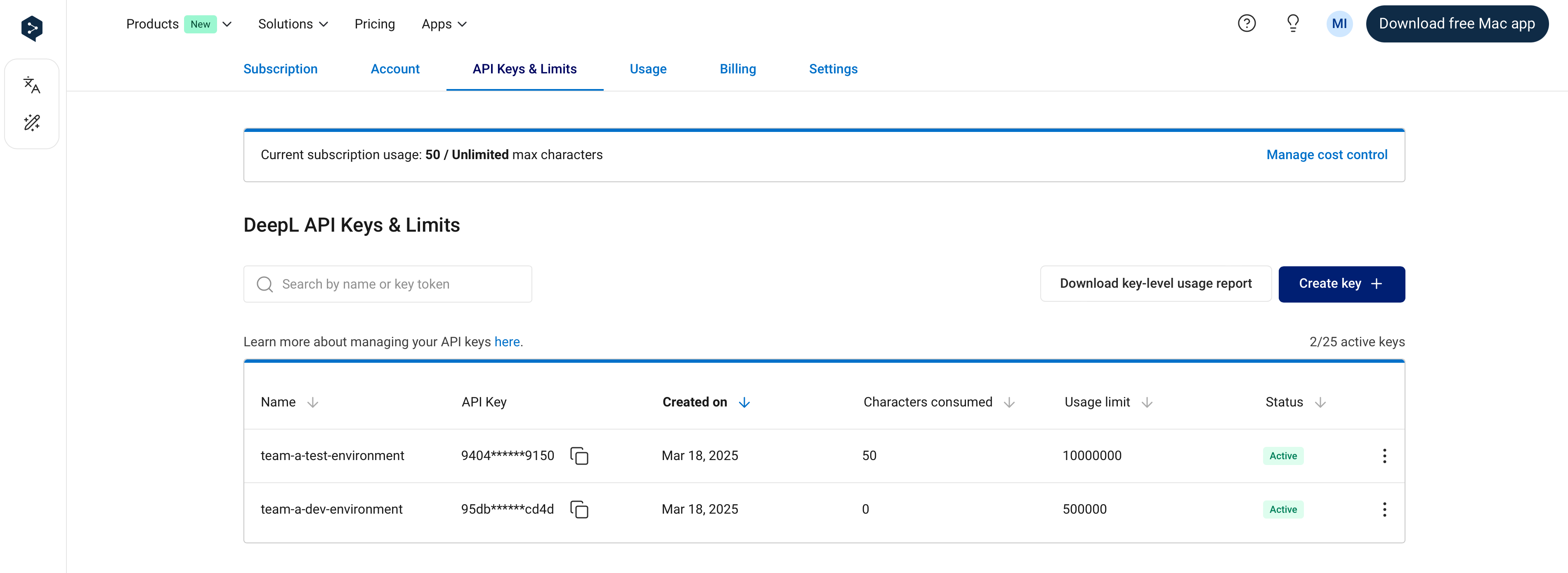 You can find and manage your API keys in the “API Keys & Limits” tab when signed into your DeepL API account. It’s possible to create multiple, simultaneously active API keys in a single API subscription.